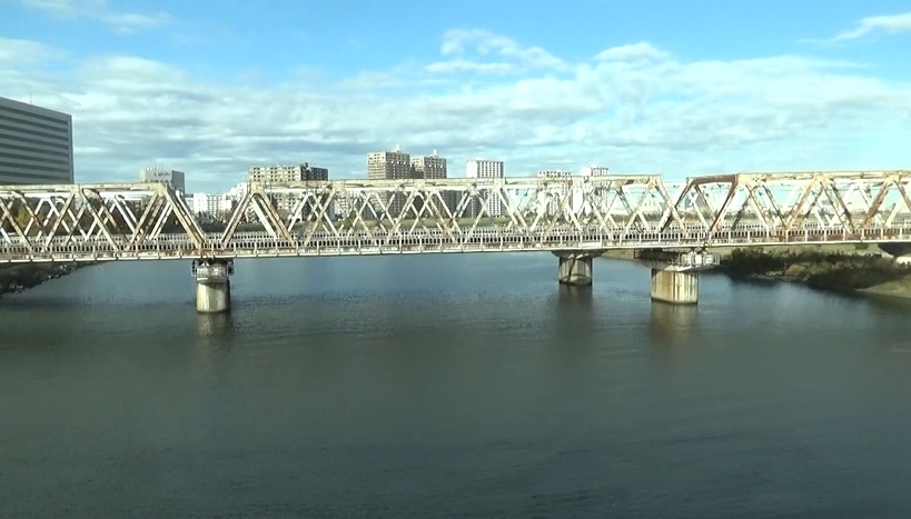 国道15号を東へ。橋を渡ろうとしたら上流側に壁があって景色